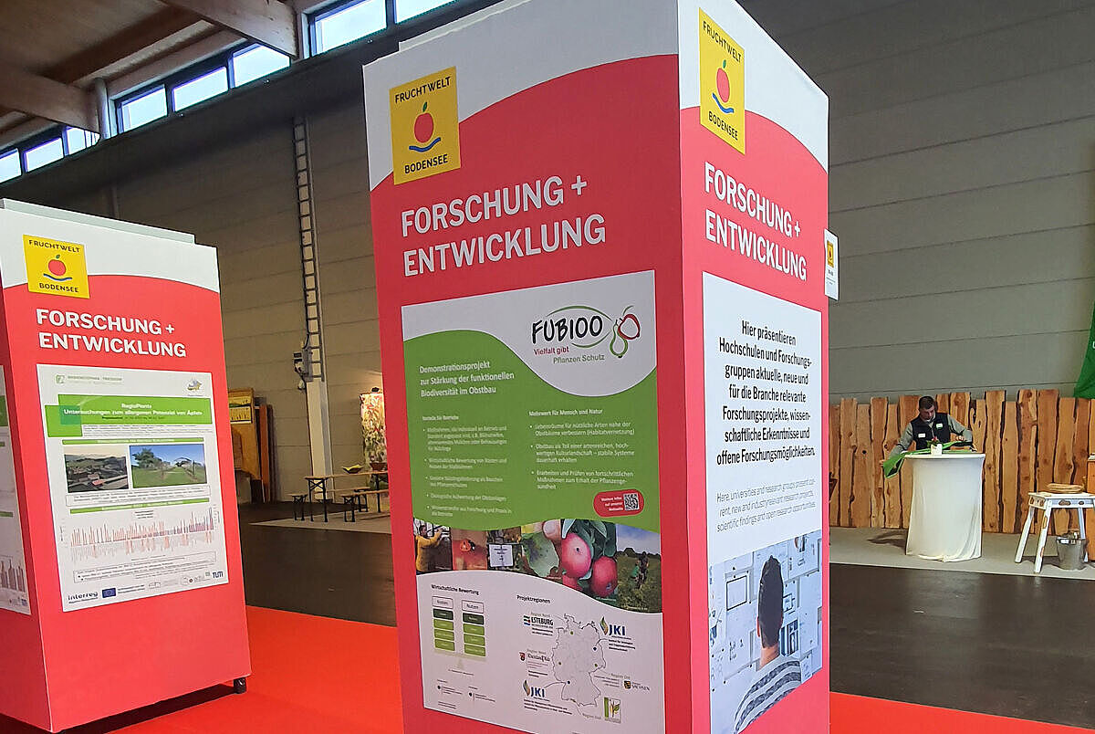 Eine Ohrwurmbehausung an einem blühenden Apfelbaum: für die Besucherinnen und Besucher der Fruchtwelt Bodensee wurde so erlebbar, wie biodiversitätsfördernde Maßnahmen in der Praxis aussehen können. Mit großem Interesse informierten sich Obstbäuerinnen und Obstbauern am Stand des Kompetenzzentrums Obstbau Bodensee (KOB) über das FUBIOO-Projekt und weitere obstbauliche Themen.
