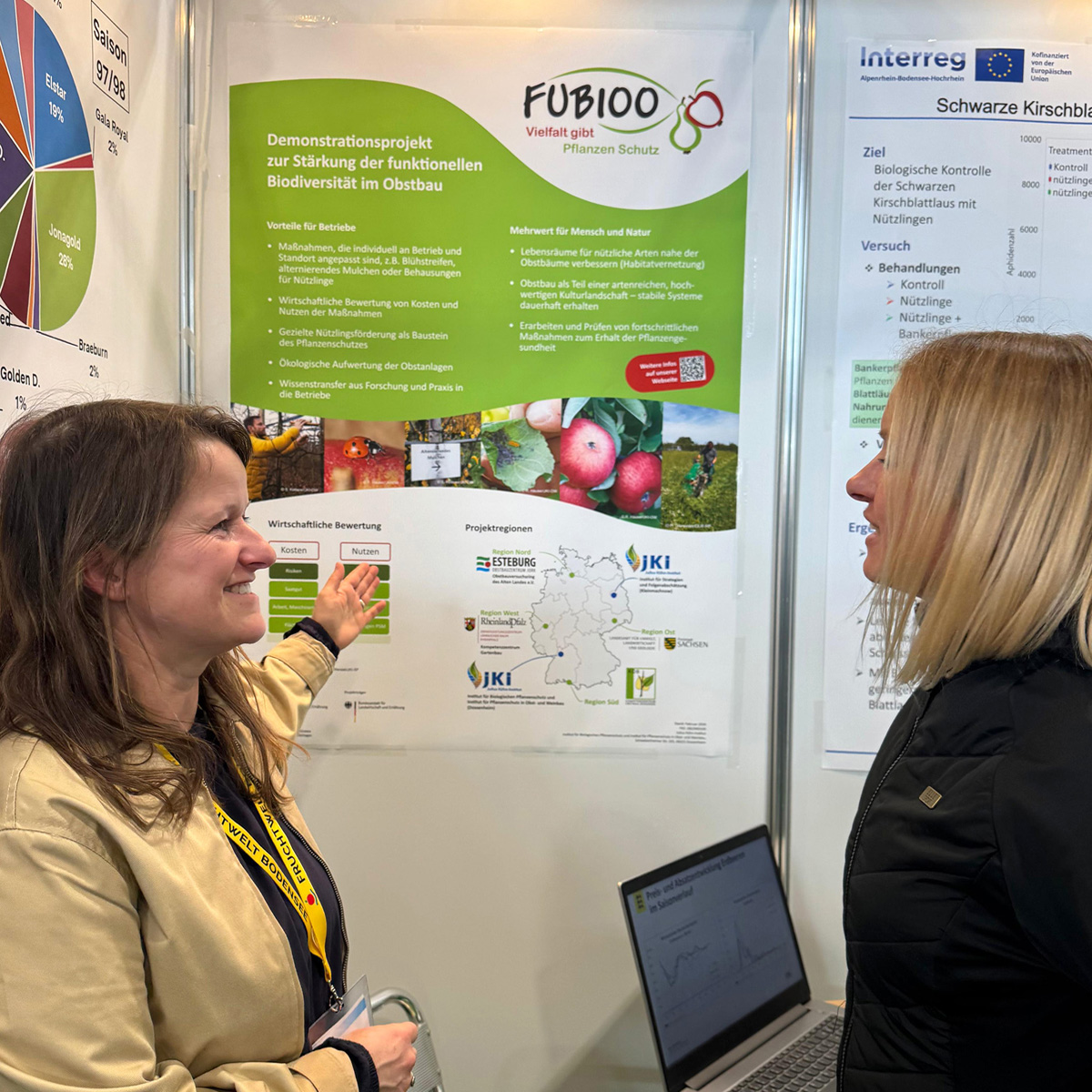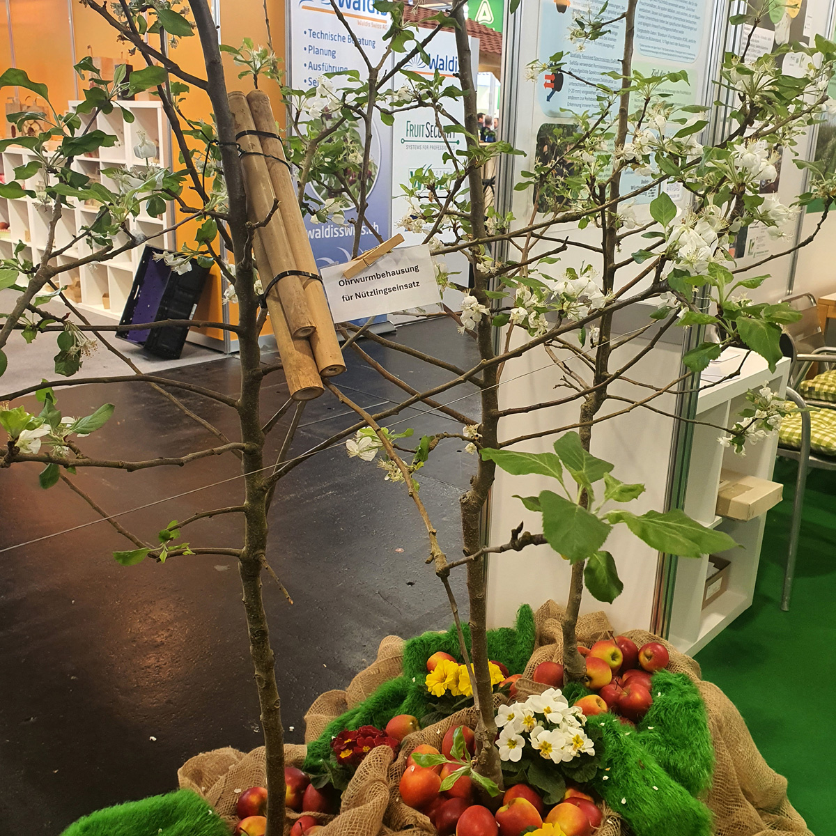 Melanie Hagl, die Regionalkoordinatorin der FUBIOO-Region Süd, beantwortete die Fragen der Messebesucherinnen und -besucher. Einige Personen berichteten ihr, dass sie ähnliche Ohrwurmbehausungen, wie die auf der Messe ausgestellte, selbst in ihren Anlagen einsetzten. Damit schaffen sie für die nützlichen, nachtaktiven Ohrwürmer einen Unterschlupf, in dem sie sich tagsüber verkriechen können. Das sorgt für weniger Verschmutzungen an den Äpfeln, denn die Tiere hinterlassen ihren Kot nicht mehr in den Stilgruben der Äpfel, sondern in den Behausungen.