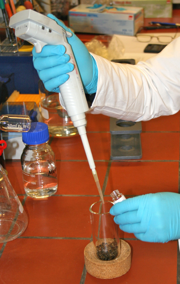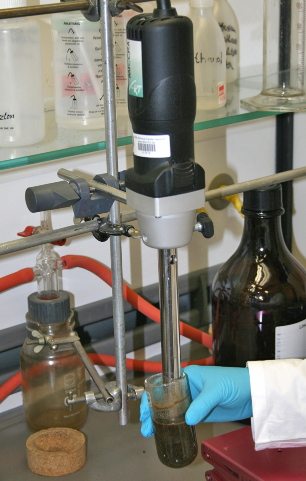 Zerkleinerung und Extraktion einer Rapsprobe: Die Analysenprobe wird in ein Zentrifugenglas gegeben und mit einem für die Extraktion der gesuchten Wirkstoffe geeigneten Lösungsmittelgemisch (Aceton/Wasser) sowie dem Kontrollstandard (Surrogat) versetzt. Nach einer Einwirkzeit von 30 min wird jede Probe 3 min mit einem Dispergierstab (Zerkleinerungsgerät) homogenisiert. Der Kontrollstandard wird dazu benötigt, die Qualität der gesamten Analyse zu beurteilen.