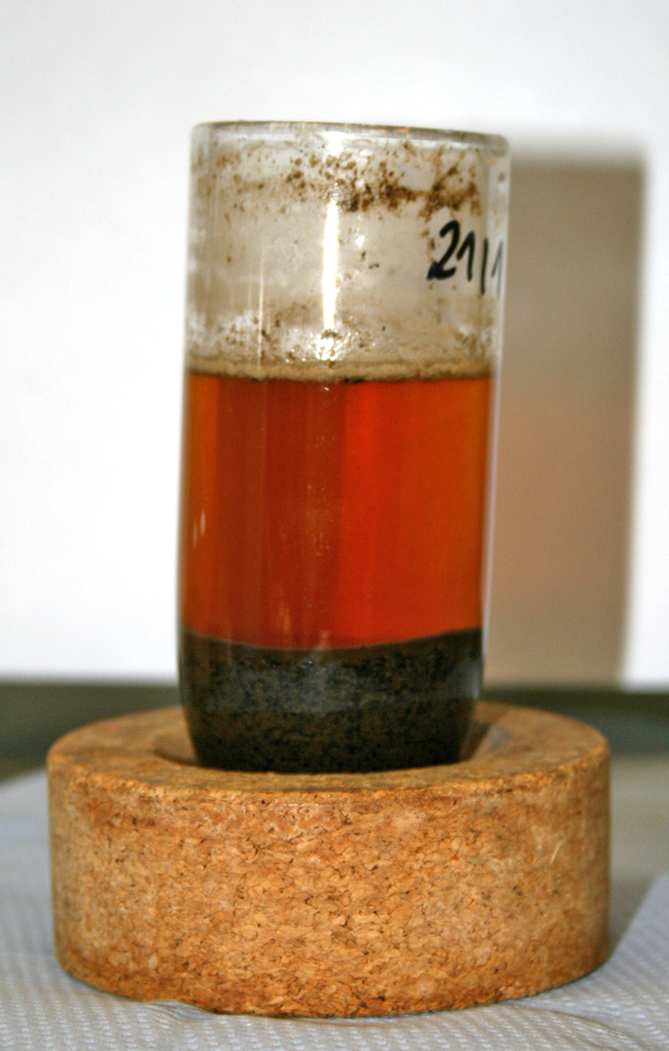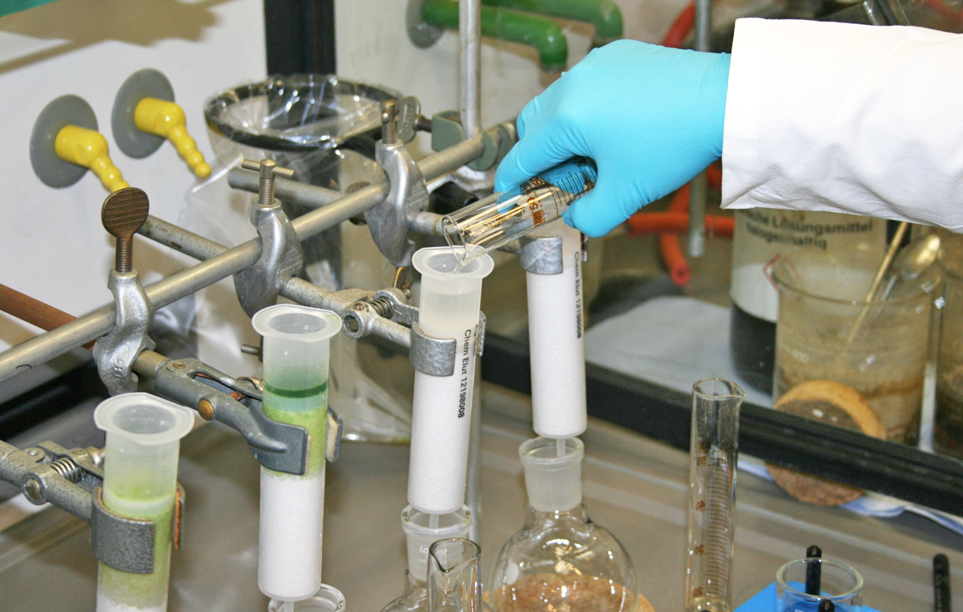 Zentrifugieren und Flüssigextraktion mit ChemElut-Kartuschen: Der homogenisierte Rohextrakt wird zur Abtrennung fester, ungelöster Bestandteile zentrifugiert. Von der klaren, über dem Bodensatz stehenden Lösung wird ein genau abgemessener Teil auf eine ChemElut-Kartusche gegeben. ChemElut ist der Name für mit Diatomeenerde (=Kieselgur) gefüllte Kartuschen, die als Ersatz für die klassische Flüssig-Flüssig-Extraktion verwendet werden. Die zugegebene Flüssigkeit wird von der Diatomeenerde komplett aufgenommen. Nach einer Einwirkzeit von 15 min werden die Analyten mit einem organischen Lösungsmittel (Dichlormethan) eluiert, das mit Wasser nicht mischbar ist. Je besser die Analyten im Lösungsmittel löslich sind und je schlechter in Wasser, umso höher ist die Ausbeute der Extraktion.