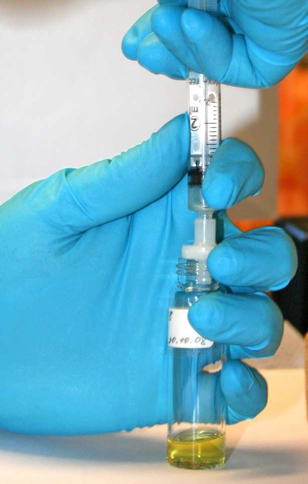 Filtration zur Herstellung der Messlösungen: Die im Rundkolben über den ausgefrorenen Begleitstoffen befindliche Lösung wird zügig mit einer Spritze aufgezogen und über einen Spritzenfilter (0,2 µm) in ein Probenfläschchen filtriert. Ein Teil des konzentrierten Probenextrakts wird für die insgesamt fünf chromatographisch-massenspektrometrischen Messungen mit LC-MS/MS und GC-MS abgefüllt.