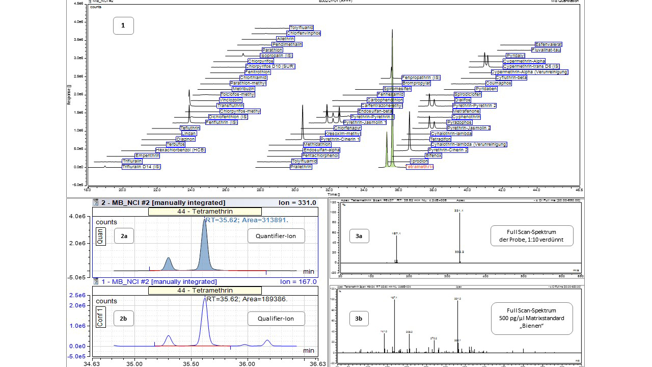 Auswertung der GC-MS-Messergebnisse: Abbildung 1 ist eine Übersicht aller in einer Bienenprobe gesuchten 59 Substanzen und 7 internen Standards (IS). Deutlich erkennbar sind die Signale (Peaks) der internen Standards, der nachgewiesenen Pyrethrine und des Tetramethrins (grün ausgemalt). Die Abbildungen 2a und 2b zeigen die Signale der für die Identifizierung und Quantifizierung erforderlichen Fragmente des Tetramethrins (Qualifier und Quantifier Ion). Die Signalfläche des Quantifier-Fragments wird für die Quantifizierung herangezogen. Daneben (Abb. 3a/3b) sind die kompletten (Full Scan-) Massenspektren der Probe (1:10 verdünnter Extrakt) und eines Matrixstandards zu sehen. Der Spektrenvergleich dient der erweiterten Absicherung des Nachweises.