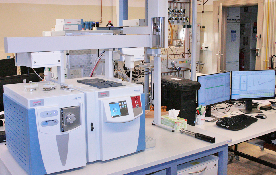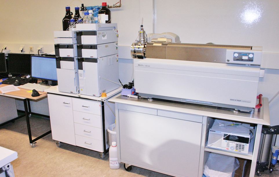 Chromatographisch-massenspektrometrische Messgeräte: Zur Erfassung aller Wirkstoffe, die auf der Screeningliste stehen, müssen mit zwei verschiedenen Messgeräten insgesamt fünf Messungen durchgeführt werden. In der linken Abbildung sieht man das GC-MS-Gerät ISQ 7000 [Negative Chemische Ionisation (NICI) und Elektronenstoß-Ionisation (EI)]. In der rechten Abbildung sieht man das LC-MS/MS-Gerät 4000 QTRAP [Elektrospray Ionisation (ESI) positiv und negativ].