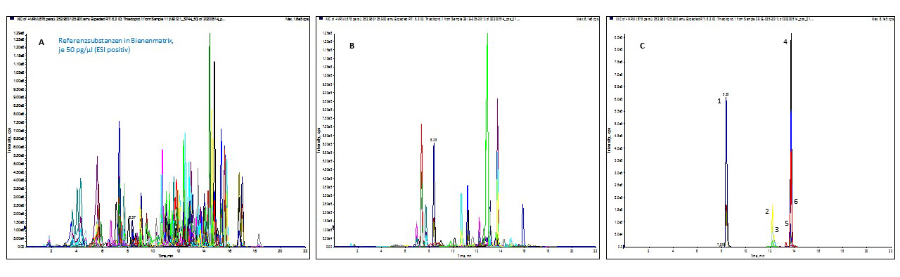 In den Extrakten der Proben wird nach vor der Messung festgelegten Zielsubstanzen (Analyten) anhand charakteristischer Massenübergänge (MRM = Multiple Reaction Monitoring) „gefahndet". Gefunden werden kann nur, was gesucht wird! In Abbildung B ist das Chromatogramm einer Bienenprobe mit den drei MRM-Übergängen diverser interner Standards und einiger nachgewiesener Wirkstoffe zu sehen. Das Chromatogramm in Abbildung C zeigt nur die jeweils drei gemessenen MRM-Übergänge für die in der Bienenprobe nachgewiesenen Wirkstoffe Thiacloprid (1), Myclobutanil (2), Fluopyram (3), Trifloxystrobin (4), Cyprodinil (5) und Difenoconazol (6).