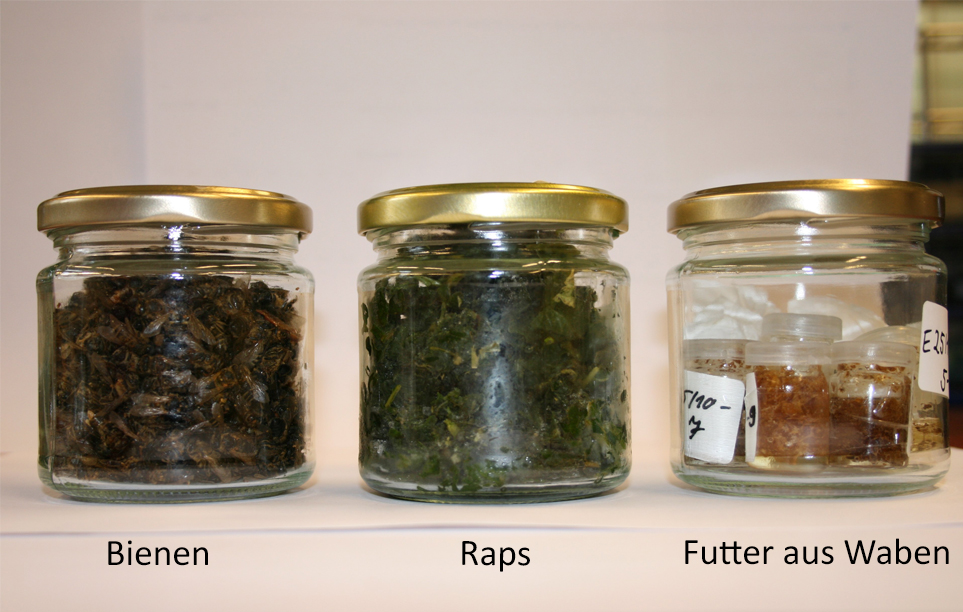 LINKS: Proben für die chemische Untersuchung: Die in Gläsern eingefrorenen Proben (Bienen, Pflanzen, Bienenbrot, Futter) werden bis zur Analyse tiefgekühlt bei ca. - 20°C gelagert.