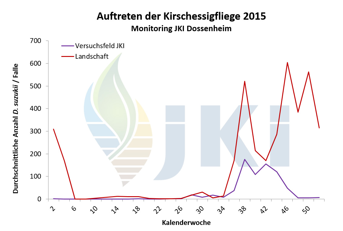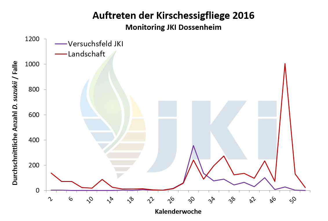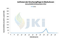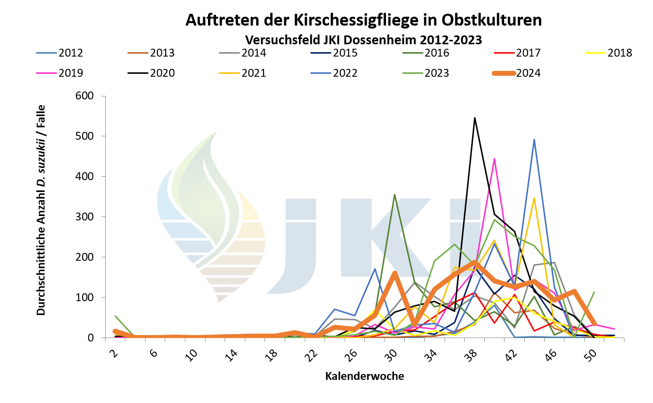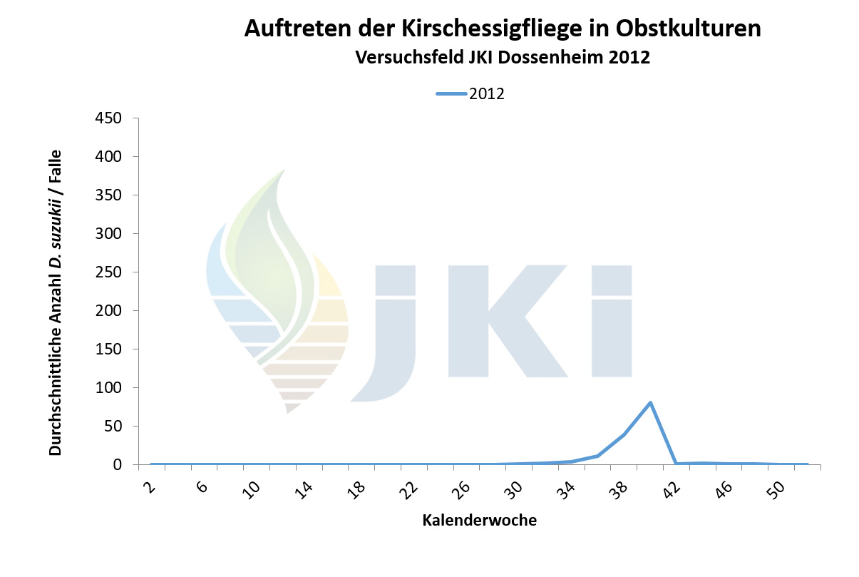 Im Jahr 2012 erfolgte ab März/April durch die Pflanzenschutzdienste der Länder und weitere Institutionen bundesweit ein intensives Monitoring mit Apfelessigfallen. Nach Nachweis einzelner Individuen im März/April am Bodensee und in Nordbaden erfolgten bis Juli bundesweit keine weiteren Fänge. Ab Juli/August dagegen war eine deutliche Zunahme der Fundorte sowie der Fangzahlen zu verzeichnen. Besonders hohe Populationsstärken wurden regional im Südwesten Deutschlands im September/Oktober festgestellt. Anhaltende Fänge waren an einigen Standorten bis Januar 2013 zu verzeichnen. Bezogen auf die Bundesländer erfolgte der Nachweis der Kirschessigfliege im Jahr 2012 erneut in Baden-Württemberg, Rheinland-Pfalz und Bayern sowie darüber hinaus nun auch in Hessen, Nordrhein-Westfalen, Niedersachsen und Brandenburg. Schwerpunkte lagen in Baden-Württemberg entlang des Oberrheins sowie am Bodensee. In Rheinland-Pfalz traten die meisten Fänge in der Pfalz und Rheinhessen auf. - Neben Fallenfängen in Erwerbsanlagen (Süß- und Sauerkirschen, Pfirsich, Zwetschge, Mirabelle, Johannisbeerarten, Holunder, Himbeeren, Brombeeren, Trauben) wurden auch zahlreiche Tiere in Hecken oder an Waldrändern mit Brombeer- oder Holundergebüsch, aber auch ohne eindeutige Wirtspflanzenzuordnung, gefangen. Es war häufig zu beobachten, dass sich die Tiere in abgeernteten Obstanlagen aufhielten. Befallsnachweise in Früchten gab es für Brombeeren, Herbsthimbeeren, Holunder sowie Trauben. Der Befall war in einigen wenigen Beerenanlagen stark, vor allem nach Abschluss der Ernte in Beständen, in denen die Früchte nicht vollständig abgeerntet wurden. Als wichtige Gegenmaßnahmen galten Hygienemaßnahmen, d.h. regelmäßiges Durchpflücken und Entfernen aller reifen Früchte sowie eine gute Belüftung der Bestände, in Kombination mit Massenfang. Beanstandungen in der Direktvermarktung oder an Großmärkten wurden nicht gemeldet.