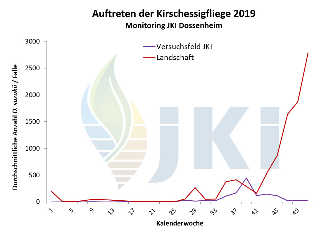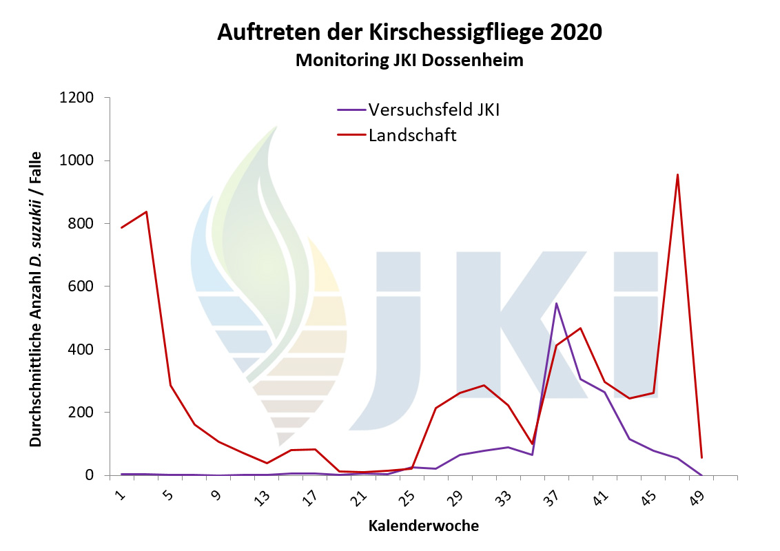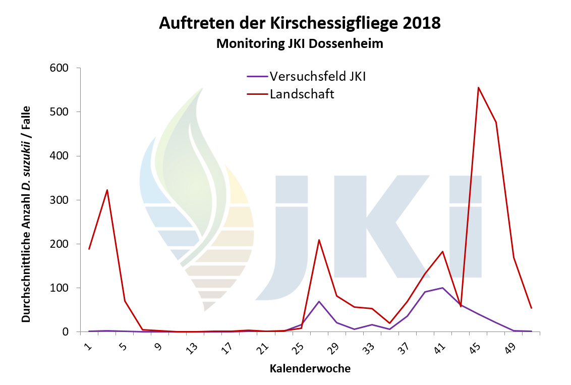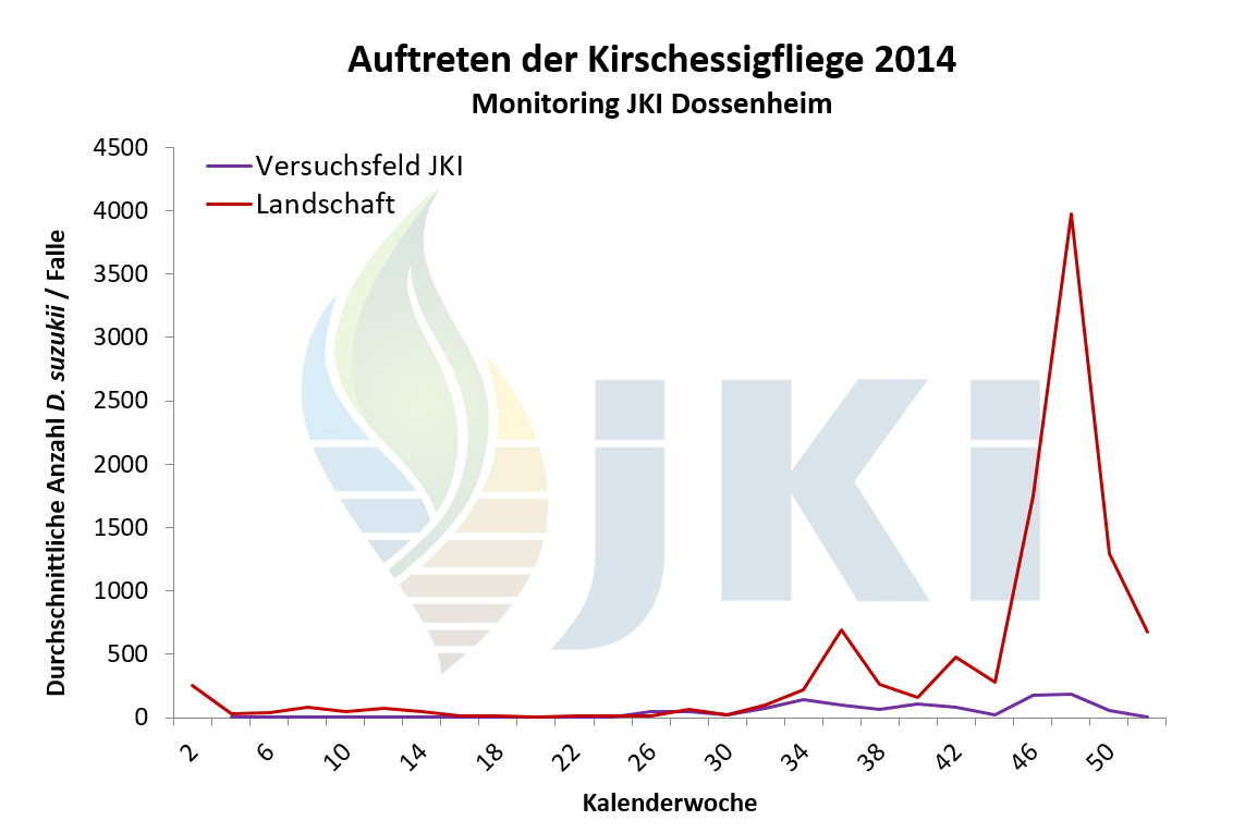 Im Jahr 2012 erfolgte ab März/April durch die Pflanzenschutzdienste der Länder und weitere Institutionen bundesweit ein intensives Monitoring mit Apfelessigfallen. Nach Nachweis einzelner Individuen im März/April am Bodensee und in Nordbaden erfolgten bis Juli bundesweit keine weiteren Fänge. Ab Juli/August dagegen war eine deutliche Zunahme der Fundorte sowie der Fangzahlen zu verzeichnen. Besonders hohe Populationsstärken wurden regional im Südwesten Deutschlands im September/Oktober festgestellt. Anhaltende Fänge waren an einigen Standorten bis Januar 2013 zu verzeichnen. Bezogen auf die Bundesländer erfolgte der Nachweis der Kirschessigfliege im Jahr 2012 erneut in Baden-Württemberg, Rheinland-Pfalz und Bayern sowie darüber hinaus nun auch in Hessen, Nordrhein-Westfalen, Niedersachsen und Brandenburg. Schwerpunkte lagen in Baden-Württemberg entlang des Oberrheins sowie am Bodensee. In Rheinland-Pfalz traten die meisten Fänge in der Pfalz und Rheinhessen auf. - Neben Fallenfängen in Erwerbsanlagen (Süß- und Sauerkirschen, Pfirsich, Zwetschge, Mirabelle, Johannisbeerarten, Holunder, Himbeeren, Brombeeren, Trauben) wurden auch zahlreiche Tiere in Hecken oder an Waldrändern mit Brombeer- oder Holundergebüsch, aber auch ohne eindeutige Wirtspflanzenzuordnung, gefangen. Es war häufig zu beobachten, dass sich die Tiere in abgeernteten Obstanlagen aufhielten. Befallsnachweise in Früchten gab es für Brombeeren, Herbsthimbeeren, Holunder sowie Trauben. Der Befall war in einigen wenigen Beerenanlagen stark, vor allem nach Abschluss der Ernte in Beständen, in denen die Früchte nicht vollständig abgeerntet wurden. Als wichtige Gegenmaßnahmen galten Hygienemaßnahmen, d.h. regelmäßiges Durchpflücken und Entfernen aller reifen Früchte sowie eine gute Belüftung der Bestände, in Kombination mit Massenfang. Beanstandungen in der Direktvermarktung oder an Großmärkten wurden nicht gemeldet.