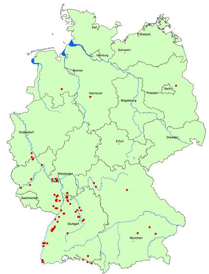 In Deutschland wurde die Art erstmals im Jahr 2011 an mehreren Standorten in Süddeutschland nachgewiesen: in Baden-Württemberg (Dossenheim, Kressbronn, Langenargen und Oberdorf am Bodensee, Rastatt, Grenzach-Wyhlen), in Rheinland-Pfalz (Siebeldingen) und in Bayern (Lindau und südlich von München in Bairawies/Dietramszell). Es handelte sich in allen Fällen um geringe Individuenzahlen ab Ende August.