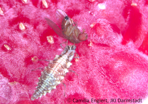 Die in Europa im Freiland erreichten Parasitierungsraten lagen in der Regel unter 10 %. In Japan wurden deutlich höhere Parasitierungsraten bei Leptopilina japonica (53 %) und Asorbara japonica (68 %) registriert. Ob zukünftig diese oder endemische Parasitoide möglicherweise zu inundativen Bekämpfungsverfahren geeignet sind, ist ein Schwerpunkt aktueller Forschung am JKI. Doch auch das Potential anderer natürlicher Gegenspieler bei der Regulierung der Kirschessigfliege -wie Ohrwurm und insektenpathogene Nematoden- wird derzeit von uns untersucht.