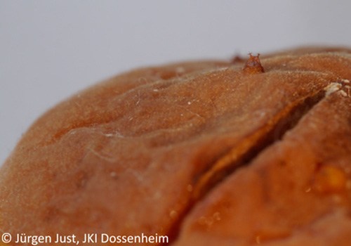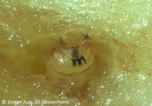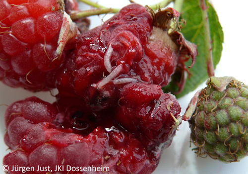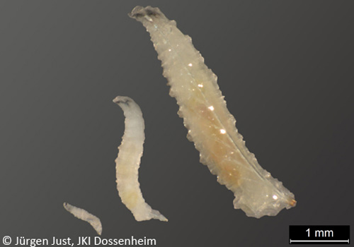 Die Larven (Maden) sind klein (max. 3,5 mm), weiß und zylindrisch. Sie ernähren sich vom Fruchtfleisch und durchlaufen ihre komplette Entwicklung über drei Larvenstadien in der Frucht. Es finden sich meist mehrere Larven pro Frucht. Die Verpuppung findet vorwiegend in der Frucht statt, wobei die Puppen meist aus der Frucht herausragen. Die Larven können aber auch die Frucht verlassen und die Verpuppung findet in der Bodenstreu statt. Die Früchte werden durch die Fraßtätigkeit der Larven weich und weisen eingesunkene und verbräunte Stellen auf. Stark befallene Früchte kollabieren völlig.