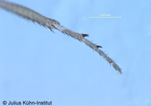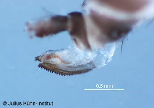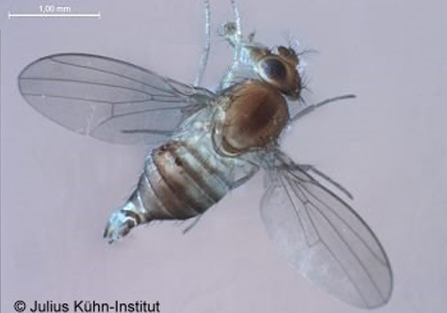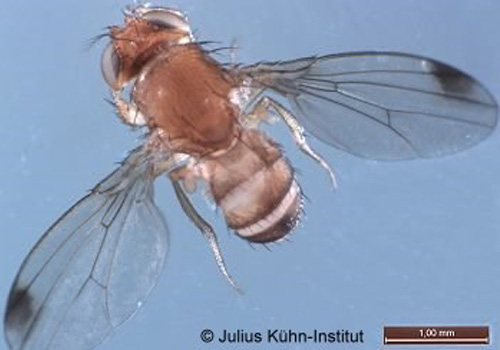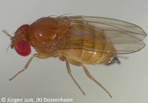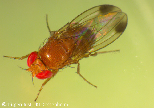 Die Fliege ist wenige Millimeter groß (Männchen 2,6-2,8 mm; Weibchen 3,2-3,4 mm) und hat rote Augen. Der Körper ist hellbraun. Die Kirschessigfliege wird im englischsprachigen Raum als Spotted Wing Drosophila (SWD) bezeichnet. Diese Bezeichnung weist auf ein typisches Merkmal bei den Männchen hin, den schwarzen Punkt an den Flügelenden. Außerdem tragen die Männchen an den Vorderbeinen auf den beiden ersten Tarsengliedern kleine einreihige schwarze Kämme, die bei der Paarung eine Rolle spielen. Den Weibchen fehlt der schwarze Punkt auf den Flügeln. Ein charakteristisches Merkmal der Weibchen ist der mit kräftigen, sägeartigen dunklen Zähnen besetzte Eilegeapparat (Ovipositor), mit dem die Weibchen die intakte Fruchthaut für die Eiablage durchdringe. D. suzukii ist aufgrund der beschriebenen Merkmale gut von anderen Drosophiliden-Arten zu unterscheiden. Es gibt allerdings in Größe und Färbung ähnliche Arten, so dass man genau auf die Merkmale achten muss (s. hierzu auch: Maßnahmen/Monitoring ). Desweiteren dauert es bei frisch geschlüpften Männchen mehrere Stunden bis zu zwei Tage, bis die schwarzen Punkte an den Flügelenden deutlich ausgefärbt sind. Eine schwache Ausprägung zeigen die Flecken in der Regel nach einigen Stunden. Zu beachten ist auch, dass die Winterformen von D. suzukii, die ab Oktober bis in den nächsten Sommer auftreten, dunkler gefärbt sind. Ein dichotomer Bestimmungsschlüssel wurde von Vlach (2010) erstellt.