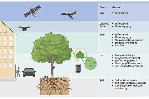 Die Wasserversorgung stellt einen wichtigen Standortfaktor für Stadtbäume dar. Durch den Klimawandel und die Versiegelung von Flächen wird die Wasserverfügbarkeit zunehmend eingeschränkt. Für die Vitalität und die damit verbundenen Ökosystemdienstleistungen der Bäume ist eine ausreichende Wasserversorgung jedoch von großer Bedeutung. Die Wasseraufnahme und damit verbundene Kohlenstoffsequestrierung wird daher an ausgewählten urbanen Standorten detailliert überwacht. Der Wasserhaushalt wird dabei an einzelnen Stadtbäumen kontinuierlich aufgezeichnet und wird durch geophysikalische Methoden wie Geoelektrik und Georadar auf ein Monitoring einer größeren Fläche erweitert.